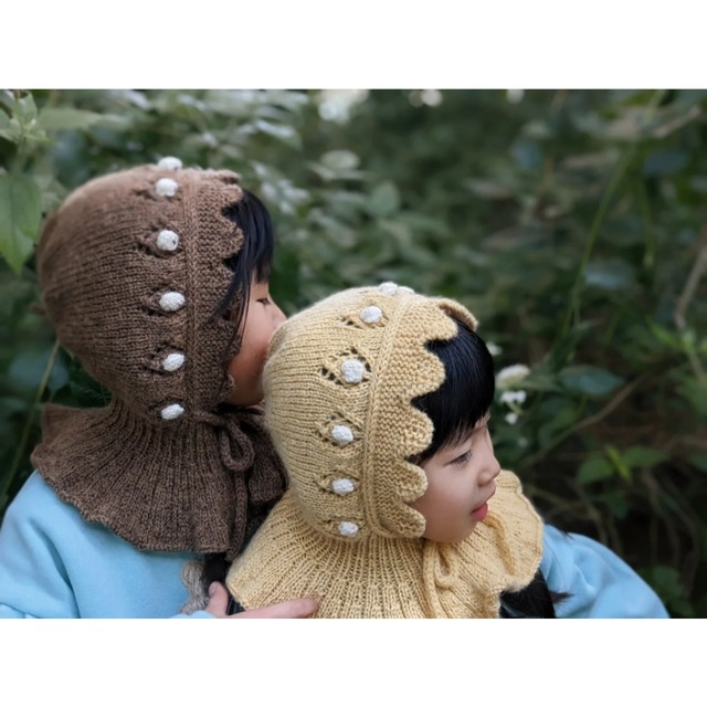 ※棒針編みの文章パターンになります。 〜〜〜〜〜 春の目覚めとともにいっせいに芽吹く野花たち。 けっして平らじゃない大地に根を張る たくましくも可憐な野の花をイメージしました。 そして、そんな野花のように健やかに育ってほしい… そんな祈りを込めてデザインした、小さな子どもたちへのボンネット帽子です。 サイズは3展開 新生児〜5歳くらいまで